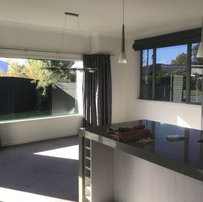A wall was knocked out creating a lovely welcoming entrance way with a slatted ply wall divider and new timber flooring was laid. In the living area new wool carpet was laid adding warmth and texture. Definition between the living kitchen/dining was created by continuing the wooden flooring used in the entrance way. The once huge living space was made snug and usable with the addition of a plywood window seat with built in shelving on either side and which is utilized daily by the clients and is now their favourite spot. A built in shelving unit was added near the fireplace, creating more storage space.